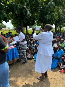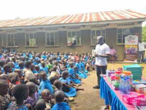 Kitabu-Buk Project commitment to this course would not have been a reality without remarkable contribution from Partner Organizations like Read To Grow- a New York Based non-profit, Read To Grow- a Dutch Organization, Baroque Book Publishers and Apple Kids Nursery School. Through these partnerships, Kitabu-Buk Project held a significant donation on the 2nd of August 2024 at the school under the theme “Uplifting West Nile Region.” The event was a collaborative effort to address some of the school’s most pressing needs where total of 250 textbooks, 384 exercise books, 40 mathematical sets for P7 candidates, 2 cartons of pens, 120 pencils, 144 packets of sanitary pads, and 20 charts were distributed, amounting to a total of Ten million shillings (UGX 10,000,000) providing much-needed relief to both students and teachers.